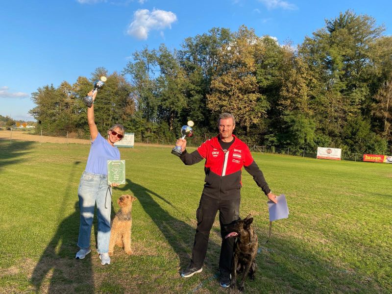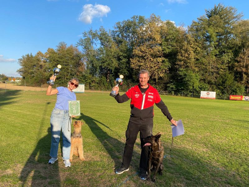 Toller Erfolg unserer Starter bei der Steirischen Landesmeisterschaft! Am vergangenen Wochenende starteten 4 Mitglieder (mit 5 Hunden) unserer OG bei der Steirischen Landesmeisterschaft beim ÖRV HSV Vogau und konnten 2 Landesmeistertitel mit nach Hause bringen. Landesmeisterin in der IBGH 2 wurde mit 91 Pkt. (Sehr gut) Katharina Schütter mit ihrer Airedale Terrier Hündin Proud to be Styrian Spirit. In der IBGH 3 holte sich, in einem starken Starterfeld von 21 Teilnehmern, Alexander Nagornik mit seinem Holländischen Herder Gino Black Highspeed Devil mit 96 Pkt. (Vorzüglich) den Landesmeistertitel. Erna Sterbik erreichte mit ihrer Libby in der IBGH 2 ein Gut mit 87 Pkt. und damit den 4. Platz. Mit Conan Black Highspeed Devil erzielte Alexander Nagornik in der IBGH 3 den 4. Platz mit 93 Pkt. (Sehr gut). Stefan Schön landete in der IBGH 3 mit seiner DS Hündin Dori vom Stieglerhof mit 90 Pkt. (Sehr Gut) auf dem 6. Platz.