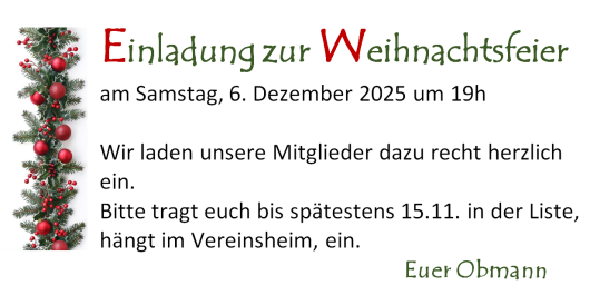 Vorschläge und Anträge zur Jahreshauptversammlung sind schriftlich einzubringen und müssen spätestens 14 Tage vorher beim Schriftführer eingetroffen sein. Wir ersuchen unsere Mitglieder recht zahlreich an der Jahreshauptversammlung teilzunehmen und damit ihr Interesse am Vereinsgeschehen zu bekunden.