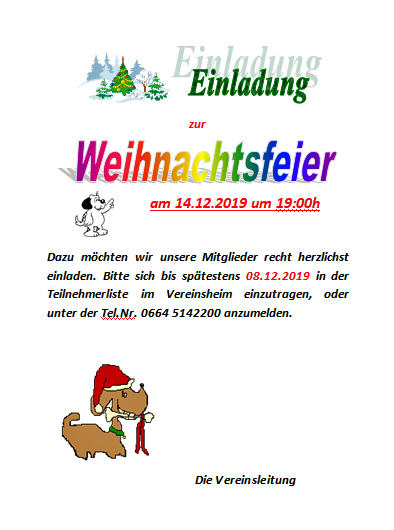 Wir laden sie recht herzlich zu unserer Jahreshauptversammlung 2019 - am 11. Jänner 2020 um 19.00h - in unserem Vereinsheim in Kapfenberg, Feldgasse 22, ein.